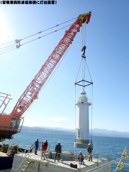 | ●倒壊から設置までの概要 | 平成29年12月26日、数日前からの厳しい波浪により高さが16mある留萌港西防波堤南灯台が基礎部分を残し、海底に倒壊しました。 この灯台は昭和50年10月13日に設置運用されてきましたが、留萌沿岸はインドのマドラス、スコットランドのウィックとともに世界3大波濤と言われているほどの厳しい環境下にあり、過去においても築港等には並大抵の努力ではなかったと聞き及んおります。このような場所で約42年間、船舶運航の安全を祈り波浪等に耐え忍び、長い間、本当にご苦労様でした。 海上保安庁では船舶運航の安全を確保するため、倒壊後も仮設の灯台を同付近に設置し、着氷した灯台の氷除去や機器メンテナスなど灯台の灯りを守り続きてきました。 この度、倒壊前と同じ場所に同程度の大きさの新設灯台を無事に設置することができたことは、ひとえに防波堤等の改修、灯台建造及び設置に携わて頂いた関係者に感謝する次第です。 今後においては、灯台を点灯させるための機器等を整備し、10月中旬頃にはすべての作業が終了し、新しい灯台での運用が始まる予定です。 なお、その状況は当部ホームページでお知らせしたいと思っております。 |