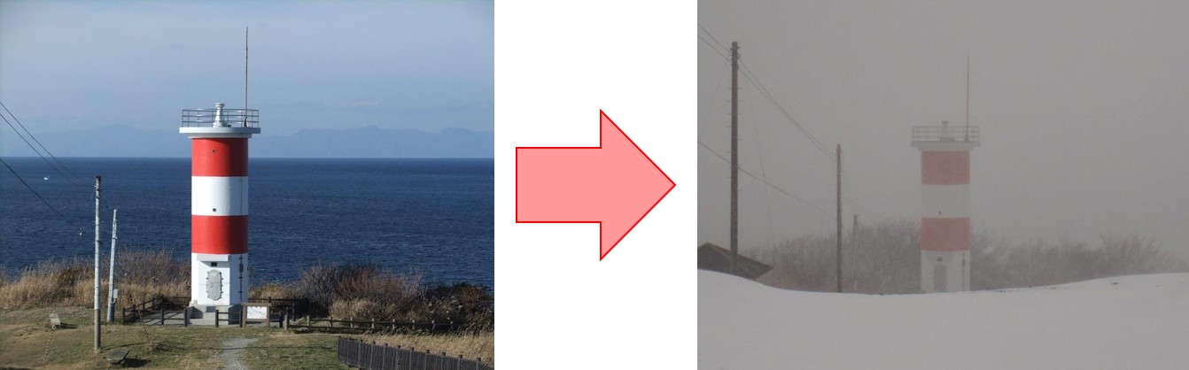 ところが、冬期、雪により白一色となる降雪地域では、白い灯台は背景に吸収され見えにくくなってしまう怖れがあります。