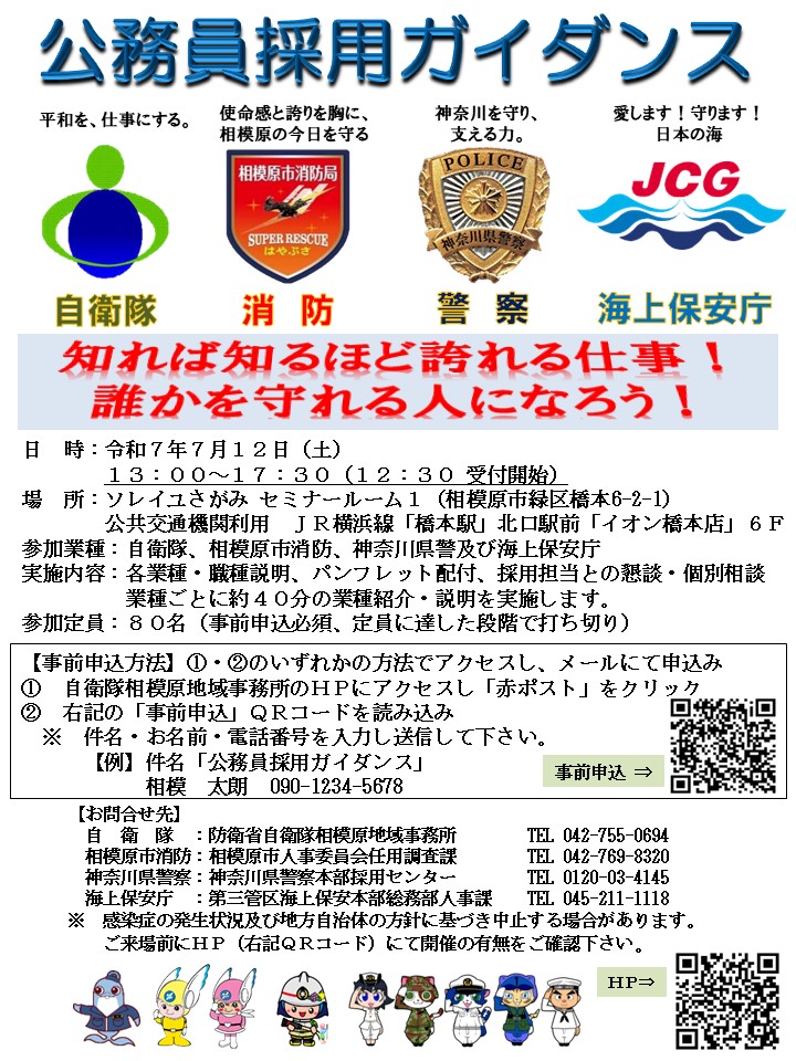 ソレイユさがみ(相模原市)において、自衛隊・警視庁・東京消防庁・海上保安庁の4機関で合同説明会を行います。