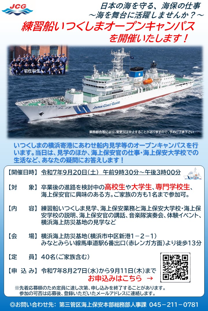 練習船いつくしまオープンキャンパス開催についてお知らせいたします。