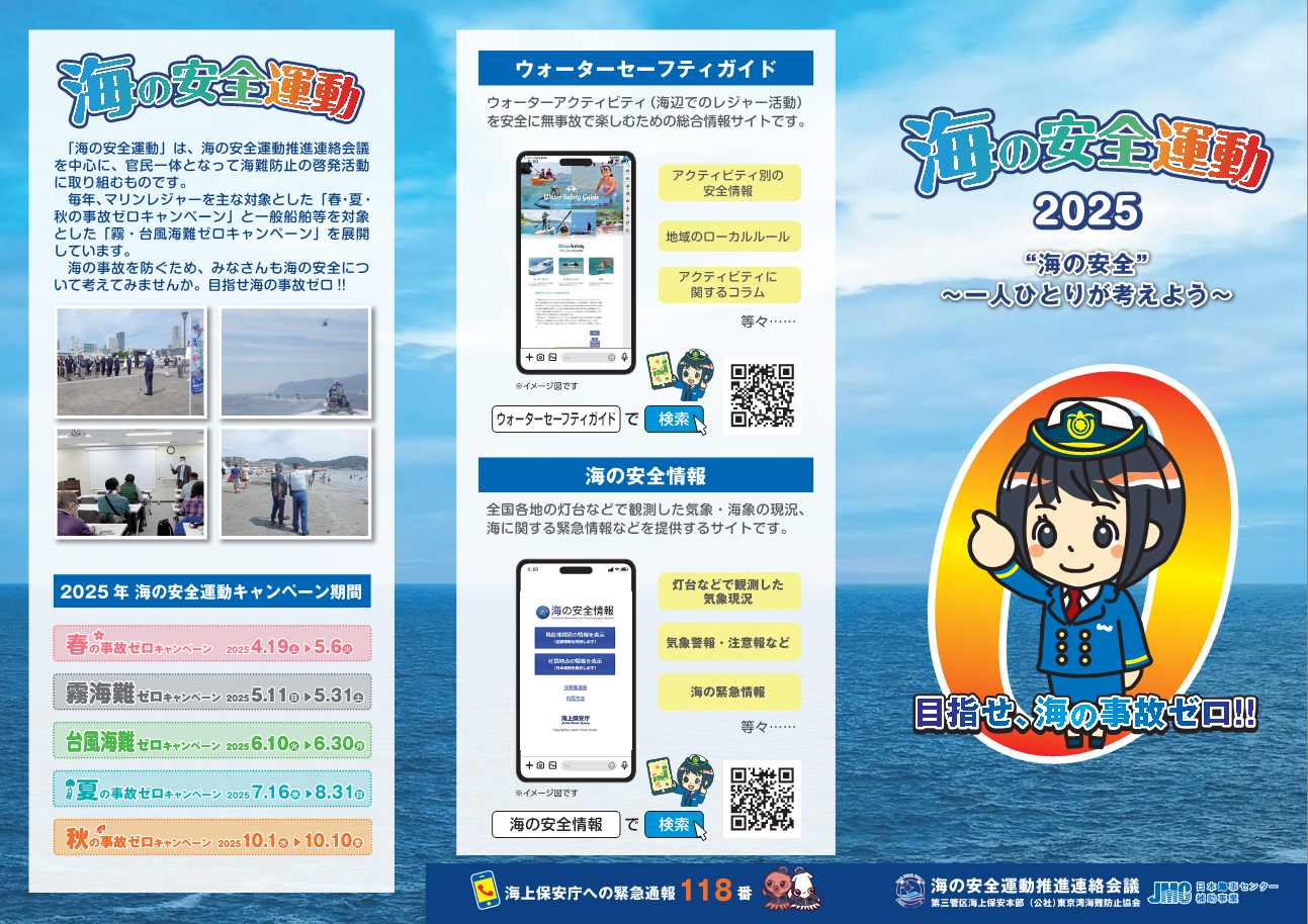 「海難ゼロへの願い」をテーマに、官民一体となって、7月16日~7月31日の間、海の事故ゼロキャンペーンを実施しています。キャンペーン期間中は、テレビ、ラジオの活用の他、各種イベントに併せた広報や、海難防止講習会における安全指導等を全国各地で行っています。