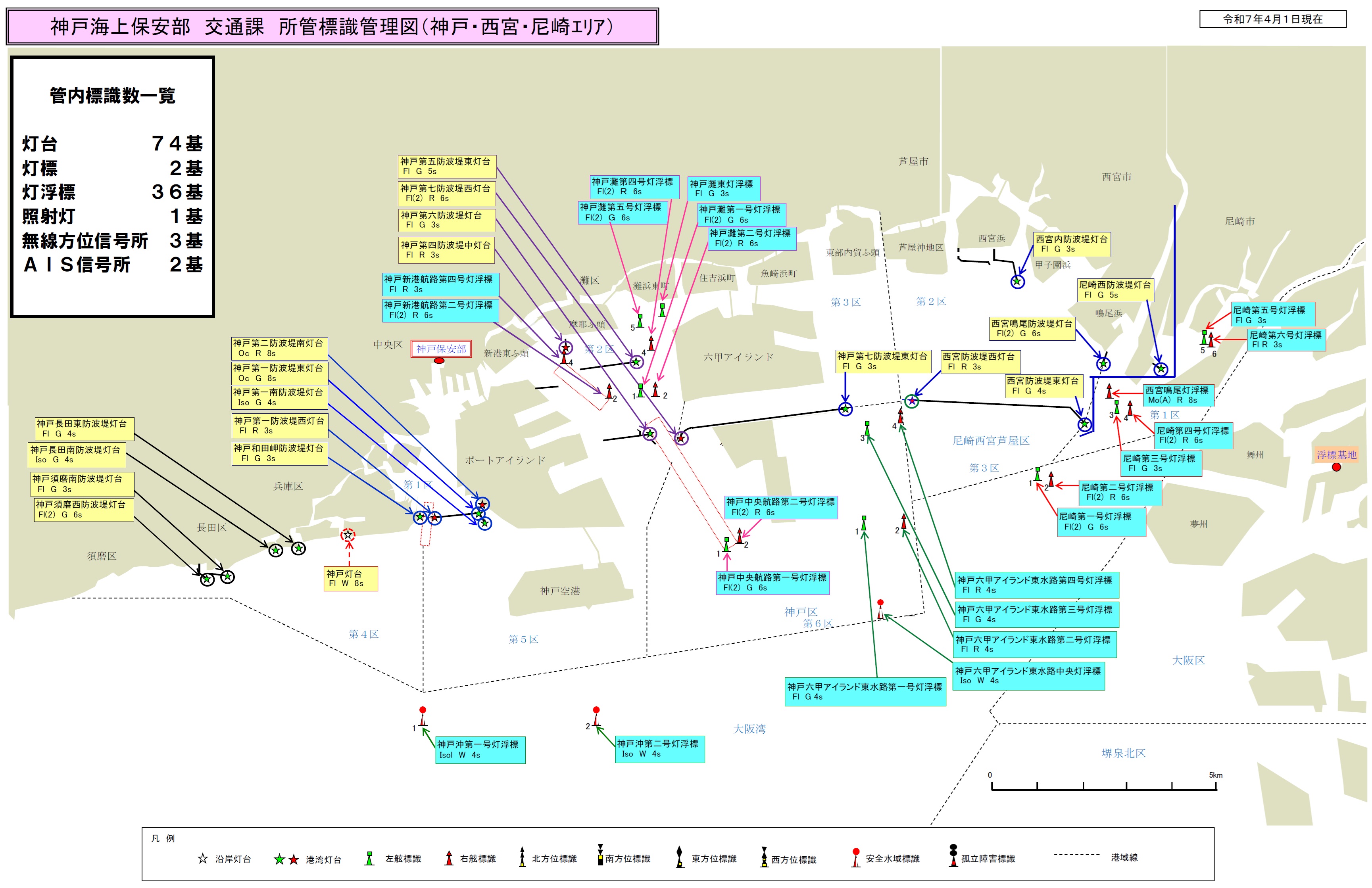 神戸海上保安部では、尼崎市、西宮市、神戸市、明石市、淡路島(沼島を含む)の沿岸域及び播磨灘の北東部から明石海峡、大阪湾、友ヶ島水道に至る海域に設置している計120基の航路標識を管理しています。