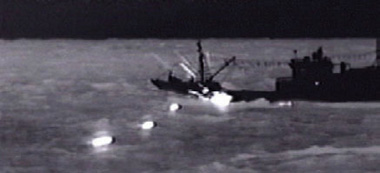 平成13年12月22日、海上保安庁は防衛庁から九州南西海域における不審船情報を入手し、直ちに巡視船・航空機を急行させ同船を捕捉すべく追尾を開始しました。同船は巡視船・航空機による度重なる停船命令を無視し、ジグザク航行をするなどして逃走を続けたため、射撃警告の後、20ミリ機関砲による上空・海面への威嚇射撃及び威嚇のための船体射撃を行いました。しかしながら、同船は引き続き逃走し、巡視船に対し自動小銃及びロケットランチャーによる攻撃を行ったため、巡視船による正当防衛射撃を実施し、その後同船は自爆用爆発物によるものと思われる爆発を起こして沈没しました。その際、巡視船「あまみ」乗船の海上保安官3名が、約7〜10日間の入院・加療を要する傷害を負いました。