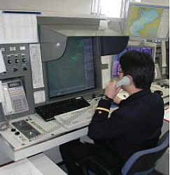 運用管制官は、海上交通センター*1に勤務し、航海の安全に役立つ情報の提供や海上交通安全法等に基づく航行管制を、24時間体制で行っています。具体的には、VHF通信を通じて航行制限の状況、海難状況、巨大船等の航行状況、操業漁船の状況、気象状況、工事作業の情報、自船の船位、他船の動向等の情報を必要に応じて提供しています。衝突の危険性がある場合などは、船舶を個別に呼び出し、直接注意を促します。また、巨船等から航路入航予定時刻等の通報を受け、航路にスムーズに入航できるように管制計画を作成し、入航順序、入航時刻の調整を行うとともに、霧等による視界不良 時には、船舶の航路入航制限等を行っています。 |