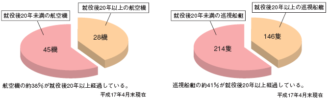 平成16年度末現在、日本全国で活躍している巡視船艇・航空機のうち、就役後の経過年数が20年を超えた巡視船艇・航空機の数は、円グラフのとおりとなっています。これらの巡視船艇・航空機は、長年にわたる使用に伴い、船体・機関各部が衰耗するとともに、各機器の維持が困難になってきています。