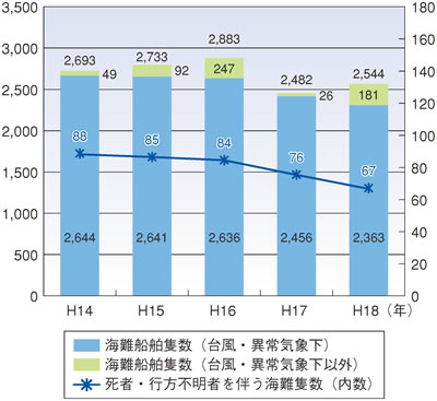 平成18年の海難を振り返ると、海難隻数は2,544隻(平成17年比62隻増)であり、死者・行方不明者数は108人(平成17年比13人減)でした。 特徴としては、10月の異常に発達した低気圧に伴い、三陸沿岸や北海道東方沿岸などにおいて128隻もの海難が発生したことが挙げられます。その海難のほとんどは無人係留中の小型漁船等の転覆や浸水海難でありましたが、宮城県女川港沖の漁船、茨城県鹿島港沖の外国貨物船、静岡県下田港沖の遊漁船の乗揚・転覆海難等においては多数の死者・行方不明者を伴うものとなりました。そのほか、社会的反響の大きい海難としては、東京湾口における貨物船の衝突・沈没海難や多数の負傷者が発生した超高速旅客船の衝突海難が挙げられます。 過去5年間の海難隻数は減少傾向にあり、死者・行方不明者を伴う海難隻数及びその海難に伴う死者・行方不明者数については、過去5年間で最低となっています。 海上保安庁では、平成9年に東京湾で巨大原油タンカー「ダイヤモンド・グレース」の座礁海難が発生したことを契機として、ふくそう海域における航路を閉そくするような大規模海難の未然防止を目標に取り組んできたところです。 今後とも海難の原因を究明し、対策を講じることによって更なる海上交通の安全性の向上に努めます。 ■海難船舶隻数及び死者・行方不明者を伴う海難船舶隻数の推移 ![]() 船舶航行環境の変化を的確にとらえ、船舶交通の安全性と運航能率の更なる向上を目指します。また、海難を未然に防止し、船舶交通の安全を確保するため、日頃から航行の安全のための情報を広く提供するとともに、海難防止思想の普及のための取組みを積極的に進めていきます。