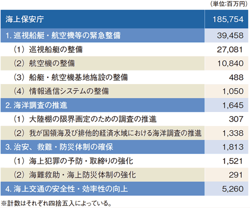 飛行機については、我が国の排他的経済水域の監視取締りや情報収集等が継続的に実施できる体制を構築するとともに、我が国周辺海域の監視体制強化のため、航続性能、捜索監視能力に優れた飛行機の整備を進めています。