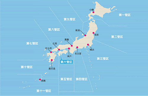 本庁には長官の下に総務部、装備技術部、警備救難部、海洋情報部、交通部の5つの部局を置いています。本庁は、基本的な政策の策定、海上保安業務に関する法令の制定 や改正、他省庁との調整を行うなど、海上保安行政の「舵取り」役を担っています。 地方については全国を11の海上保安管区に分け、それぞれに管区海上保安本部を設置し担任水域を定めています。各管区海上保安本部には海上保安部、海上保安署や航空基地等の事務所を配置しており、これら現場第一線においては治安の維持や海難救助、船舶交通の安全確保等に日夜努めています。また大規模事案発生時には、勢力を集中的に投入するなど、担任水域にとらわれない柔軟な運用にも努めています。 さらに海上保安庁では、海上保安大学校(広島県)や海上保安学校(京都府)等の教育機関を設置しています。そこでは未来の海上保安官が、海上保安業務に必要な学 術や技能を学び、あわせて心身の練成を図っています。(詳しくは、目指せ!海上保安官 - 海上保安大学校をご覧ください。)