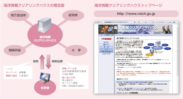 海上保安庁が運営している日本海洋データセンター(JODC)では、国内の海洋調査機関によって得られた海洋データを一元的に収集・管理し、インターネット等を通じて提供を行っています。 また、総合海洋政策本部事務局の調整のもと、平成22年3月から、国の各関係機関が保有する様々な海洋情報の所在情報を、これまでJODCが扱っていなかった種類のデータも含め、一元的に検索できる海洋情報クリアリングハウス(マリンページ)を運用しています。これにより利用者は、どの機関が、どのような海洋情報を保有し、どのような手段で提供しているのかを容易に検索することができます。