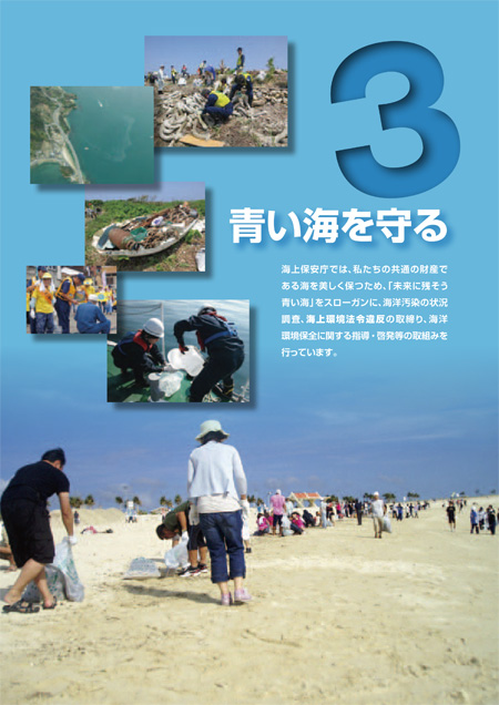 海上保安庁では、私たちの共通の財産である海を美しく保つため、「未来に残そう青い海」をスローガンに、海洋汚染の状況調査、