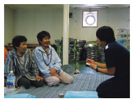 島民を救出するための町営フェリー入港に際し、測量船「拓洋」は、島民避難のサポートのため搭載艇を降下し、乗組員を上陸させましたが、その直前、主計科では、島民のためと懸命に「おにぎり」をにぎり、上陸する乗組員に託しました。このおにぎりは、朝から乾パンしか食べていない島民の方々に大変喜ばれました。