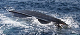 | 転覆状態で発見された木造船(福井県福井市沖約50海里の海上) |