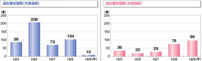 尖閣諸島周辺海域では、外国漁船による活動も続いています。平成29年の領海からの退去警告隻数は、中国漁船については10隻となっており、昨年に比べ減少していますが、台湾漁船については96隻と昨年に比べて増加しています。同海域には多数の外国漁船が存在しており、引き続き警戒していく必要があります。