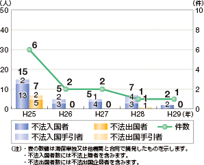 平成29年における密航事犯の摘発件数は1件であり、摘発者数については、不法入国者2名でした。
