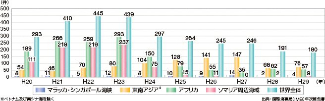 平成29年の東南アジア海域における海賊等発生件数は76件です。発生件数は、平成28年には7年ぶりに減少に転じましたが、平成29年には再び増加しました。