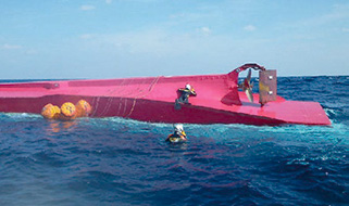 | 転覆船の船底をたたき生存者を捜す潜水士 |