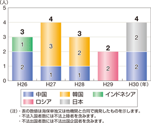 平成30年における密航事犯の摘発件数は2件であり、摘発者数については、不法入国者2名、不法出国者1名、不法出国手引者1名でした。
