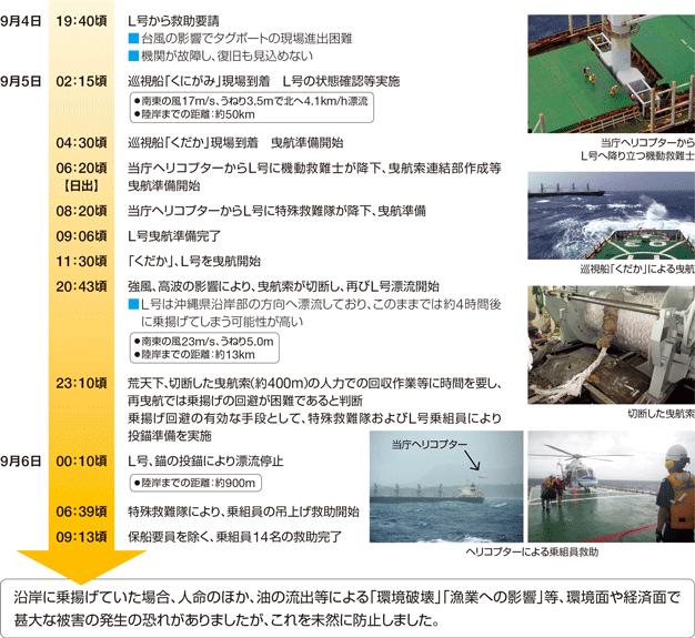 現場海域には台風13号が迫っており、暴風が吹き荒れ、高波などにより救助作業は困難を極めましたが、巡視船、航空機、特殊救難隊、機動救難士等の活躍により無事に救助を完遂しました。