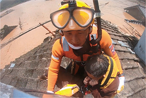 令和2年7月、日本列島上空に梅雨前線が長期にわたって居座り、所により大雨特別警報も発令された集中豪雨(後に「令和2年7月豪雨」と名称化)によって、九州から山陰、中部、北陸、東北地方の広範囲で河川氾濫、家屋の孤立などの被害が発生しました。 海上保安庁では、海から離れた陸の被災地にも出動。被害が大きかった熊本県人吉市をはじめとする球磨川流域では、ヘリコプターや特殊救難隊・機動救難士により、孤立者22名の救助や避難所への食糧等の輸送を行ったほか、熊本県八代港では、大型巡視船による給水支援を行いました。