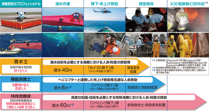 〜『苦しい 疲れた もうやめた では 人の命は救えない』〜 海難救助には、海上という特殊な環境の中で、常に冷静な判断力と『絶対に助ける』という熱い想いが必要とされます。 海上保安庁では、巡視船艇・航空機を全国に配備するとともに、救助・救急体制の充実のため、潜水士や機動救難士、特殊救難隊といった海難救助のプロフェッショナルを配置しています。 潜水士(Diver)