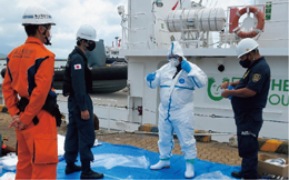 DMLE巡視船乗組員に対する感染防護衣の着装訓練 1 アジア・大洋州沿岸国への支援