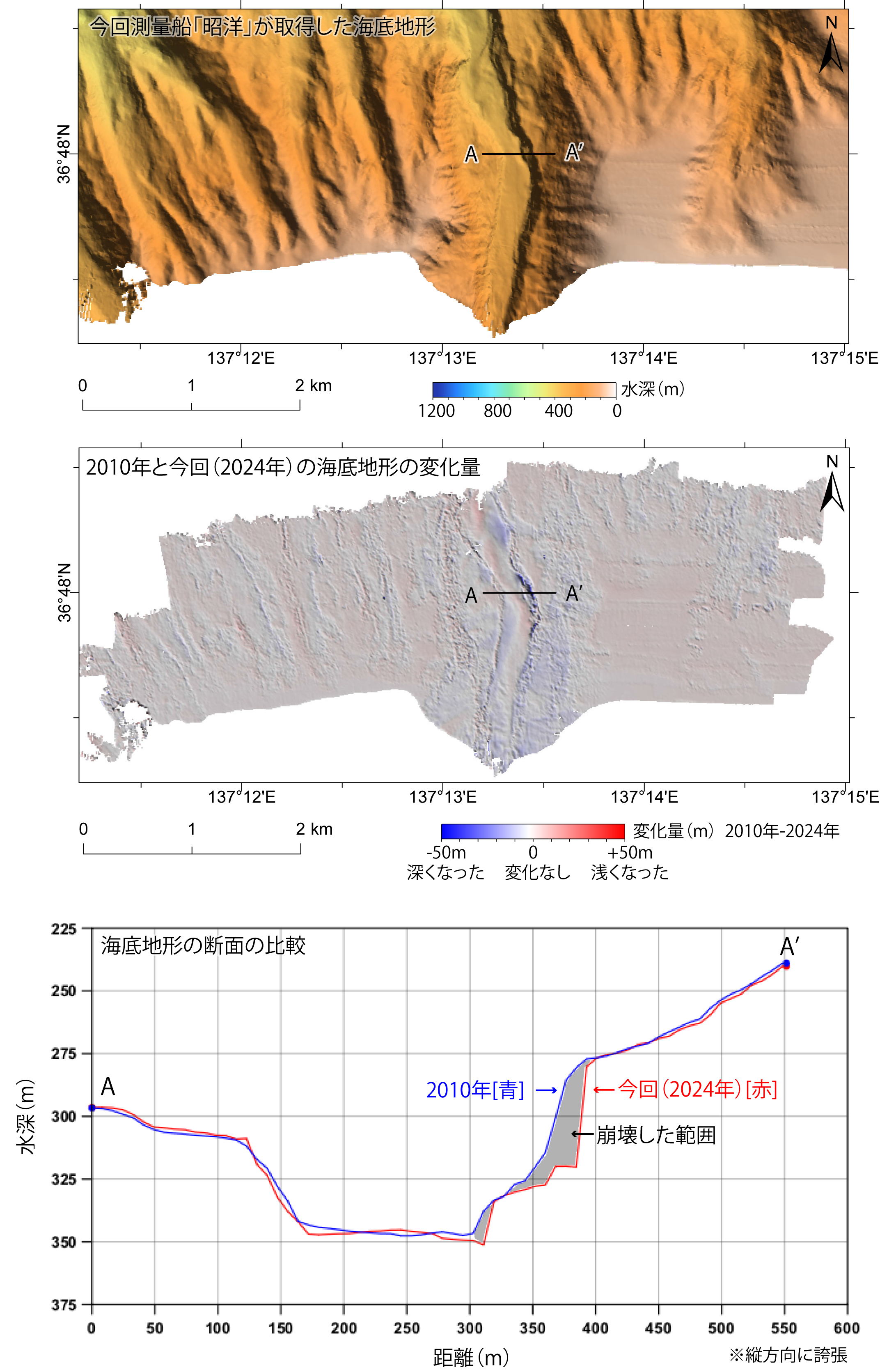 今回取得した水深データと平成22年(2010年)に北陸地方整備局伏木富山港湾事務所が取得した水深データを比較した結果、富山市沖約4kmの海底谷の斜面(水深260~330m)が、長さ約500m、幅約80mにわたって崩れ、最大40m程度深くなっていることが明らかになりました(図2)。