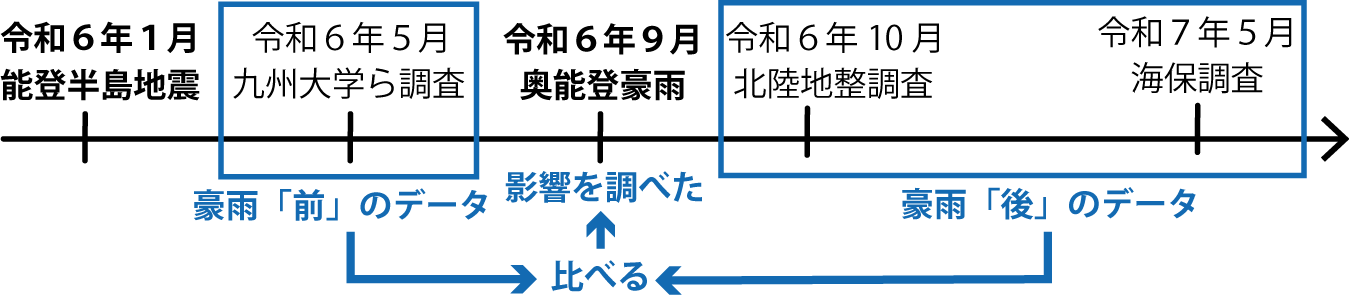 - 塚田川河口沖では、豪雨前には岩石が露出していた場所が、豪雨後には土砂で埋もれたことが確認されました(解説コラム図8へ)。塚田川の氾濫や海岸で斜面崩壊が発生し、土砂が流出した影響と考えられます。