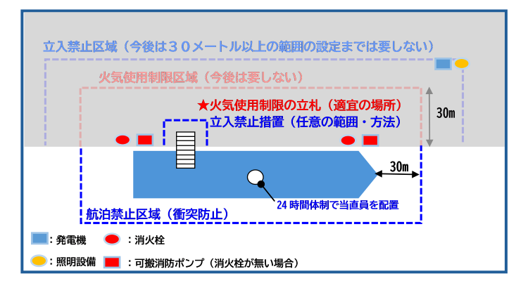 火気使用制限区域(周囲30メートル)が適切に設けられるように、LNGバンカー船の周囲30メートル以上の範囲に物理的障壁によって立入禁止区域を設定するよう指導してまいりましたが、上記(1)に伴い、立入禁止区域の範囲については、「一般人の出入状況などの岸壁環境を考慮の上、LNGバンカー船への部外者の接近・侵入防止のために必要と判断する範囲(方法は任意)」で足りるものとしました。