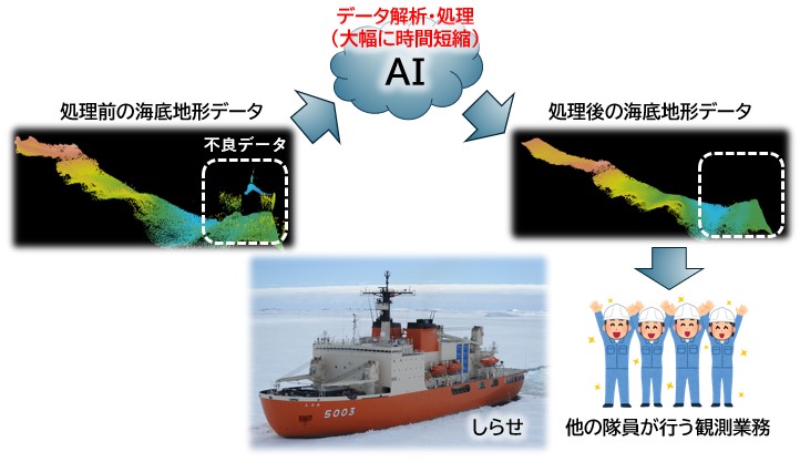 今回の観測では、新たな取組みとして「AIを用いた海底地形データの解析・処理」を行います。これにより、解析・処理時間が大幅に短縮し、他の隊員が行う観測業務の効率化などへの貢献にも期待されます。