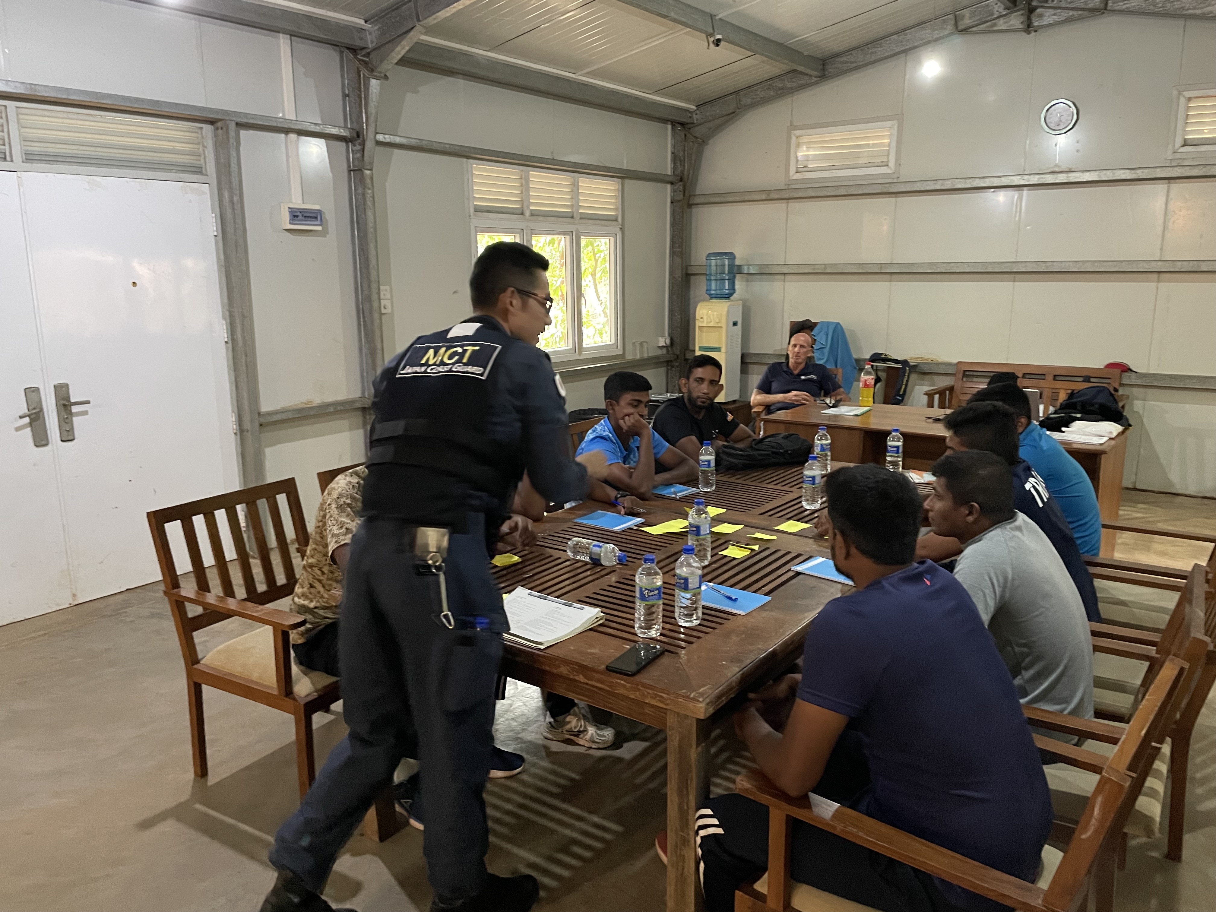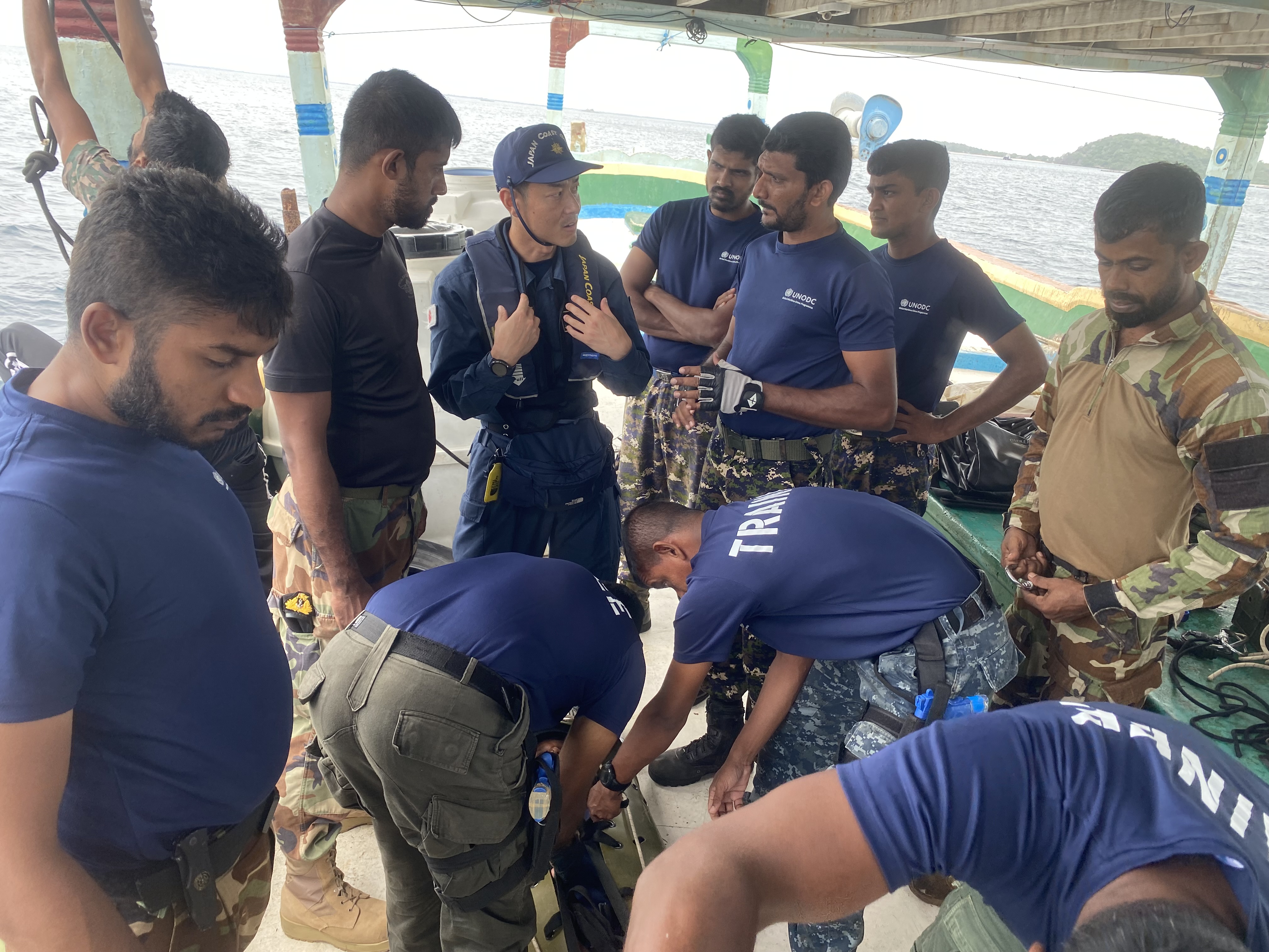 今回MCTは、スリランカのトリンコマリーにおいて、UNODCが実施するVBSS(Visit, Board, Search&Seizure)コースに指導員として参加しました。VBSSコースは、洋上における立入検査能力の向上を目的としており、実際に現場で業務に当たるスリランカ国内の関係機関職員に対して、船舶への移乗や立入検査、負傷者の救助や搬送に関する講義・訓練などを実施しました。